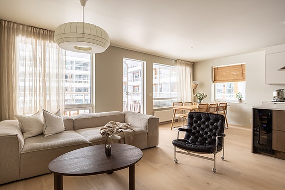 Strøken, gjennomgående 4-roms (2022) hjørneleilighet med heis, solrik balkong på 13 kvm og garasjeplass med elbillader.