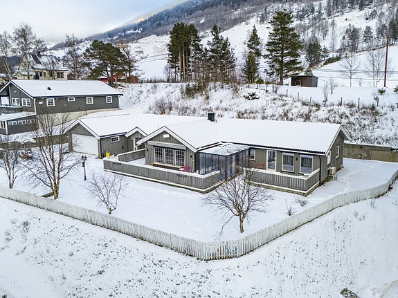 Inneholder: Vindfang m/garderobe, gang, garasje, kjølerom, ved-bod, bod, vaskerom, bad, toalettrom, 5 soverom, tv-stue, spisestue og kjøkken.