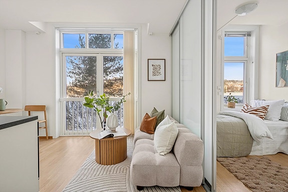 Lys og moderne 2-roms med fransk balkong mot Voldsløkka. Grønne og idylliske omgivelser. "Alt" inkl. i fellesutg. Nær BI