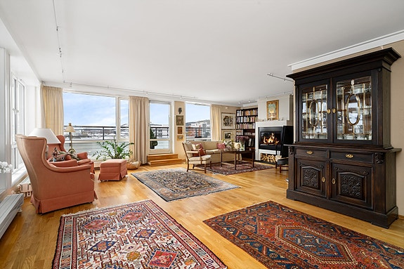 Leiligheten er gjennomgående og har store vindusflater. Fine overflater som i hovedsak består av parkett på gulv og eksklusiv lintapet på vegger. To flislagte bad med varmekabler og innfelte spotter. Det er også varmekabel i hall, og leiligheten har vannbåren varme med radiator i de fleste rom. Innfelte høyttalere fra Bang & Olufsen i tak på bad og terrasse. Egen biloppstillingsplass og bod i felles parkeringskjeller. Sameiet har heis.