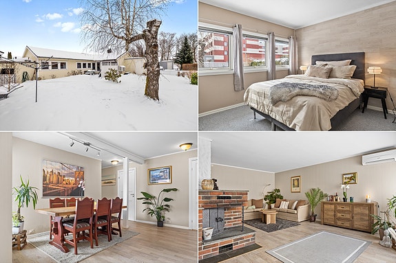 Innholdsrik og velholdt enebolig på ett plan med 3 soverom, carport og solrik, usjenert terrasse og uteplass.