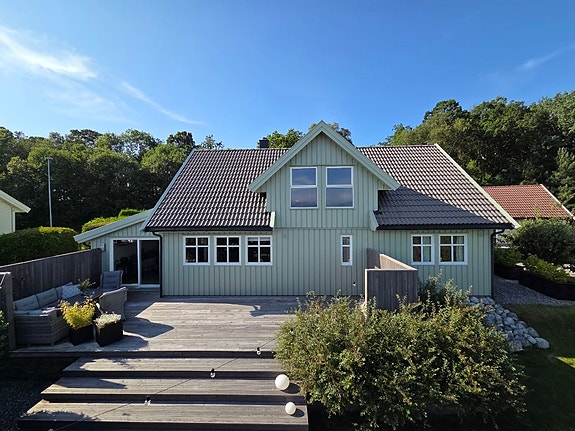Flott og innholdsrik enebolig med populær beliggenhet. Fine uteområder og garasje. Familievennlig område.
