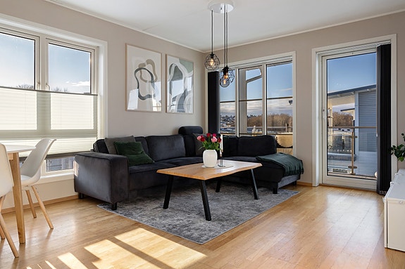Leiligheten oppleves luftig og innbydende, med balansert ventilasjon og vannbåren varme som gir et behagelig inneklima. Praktiske lagringsmuligheter med både innvendig og utvendig bod (ca. 5 kvm).