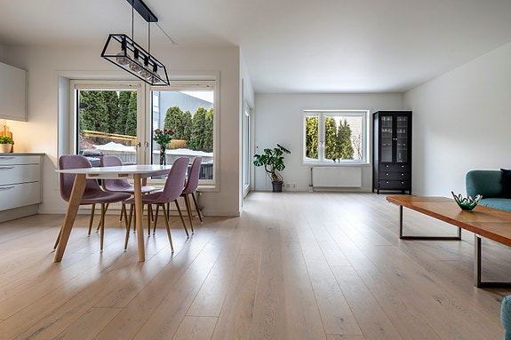 Den åpen stue-/kjøkkenløsningen gir en luftig atmosfære med store vindusflater som slipper inn rikelig med naturlig dagslys. Stuen har gode møbleringsmuligheter og kjøkkenet er utstyrt med integrerte hvitevarer. Videre har leiligheten to romslige soverom og et flislagt bad. Det er gode lagringsmuligheter i innvendig bod og disponibel bod i kjeller på ca. 10 kvm. Det medfølger én parkeringsplass med elbillader i felles garasjekjeller, og det er god dekning til gjester med hele 11 gjesteplasser.