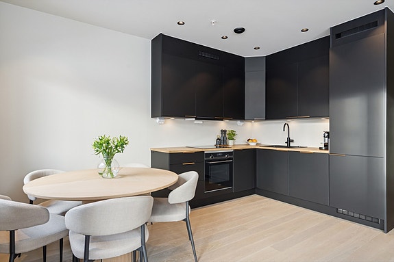 Praktisk og sosialt kjøkken med kjøkkenøy med spiseplass.