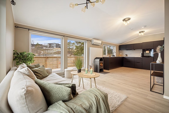 Stor tomannsbolig med gode solforhold, 4 soverom, 2 bad, 2 kjøkken og svær garasjeplass. Fremstår som ny i 2025.