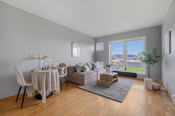 Lys og flott leilighet i toppetasje med fantastisk utsikt rett mot Aspmyra stadion. Leiligheten har 1 soverom og tilliggende hybel med gode utleiemuligheter (ca. 8 500 kr i leieinntekt per måned).