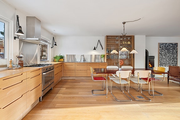 Innvendig gir bolig et solid inntrykk med moderne og tidløse materialvalg. Store vindusflater fra begge sider av boligen slipper inn rikelig med naturlig lys som skaper god romfølelse. Boligen ble gjennomgående oppusset & bygd ut i 2017 og har som følge av dette en god fordeling mellom sosiale & private soner. Idyllisk hage med påkostede skiferbelagte soner innrammet med plantekasser, trær og beplantning gir gode rammer for både hverdag & sosiale stunder.