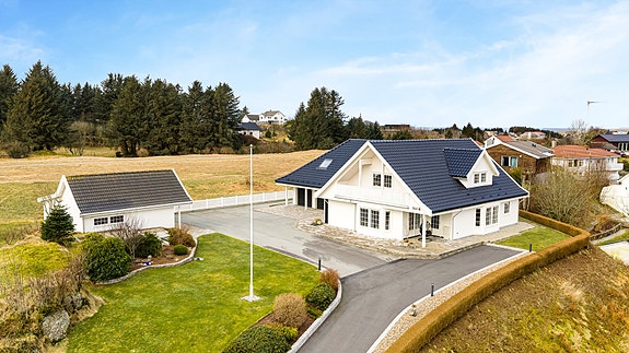 Tomten er parkmessig opparbeidet med vakre uteområder som virkelig må oppleves. Garasjer med plass til hele fire biler gir rikelig med lagrings- og parkeringsmuligheter. Her bor du skjermet og solrikt med kort vei til skole og idrettsanlegg.