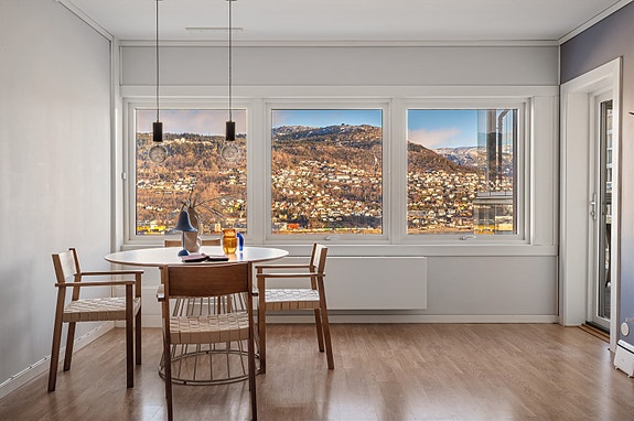 Solheimslien 14 er en romslig og gjennomgående 4-roms leilighet med fri beliggenhet og flott utsikt over Bergen sentrum og Byfjorden. Leiligheten har en god planløsning med en god stue, moderne Epoq kjøkken, tre soverom og innglasset balkong som fungerer som et ekstra oppholdsrom store deler av året. Her bor du høyt og skjermet, samtidig som du har kort vei til sentrum, kollektivtransport og flotte turområder.