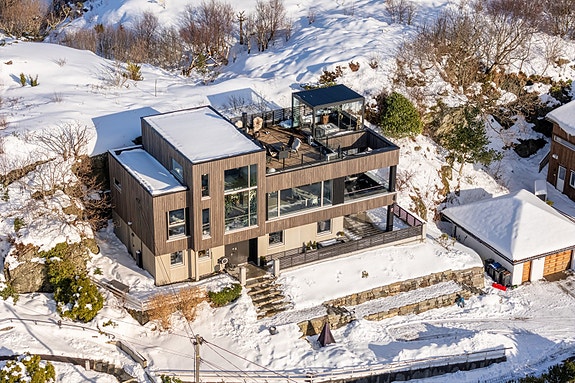 Videre kan boligen skilte med stor terrasse i alle etasjene, hvorav en fantastiske takterrasse med innglasset del. Fantastisk panoramautsikt!