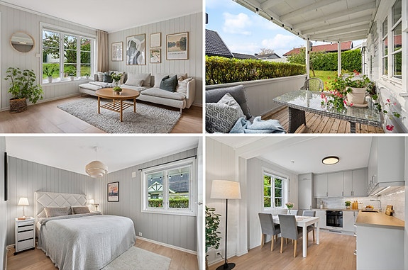 Lys og delikat 3-roms med livsløpsstandard | Solrik terrasse & hage | Fast p-plass | Sentralt og samtidig tilbaketrukket