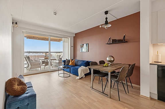 Området byr på trygge omgivelser og flotte grøntarealer som passer både til tur og hverdagsliv. Leiligheten har en gjennomtenkt planløsning med entré og skyvedørsgarderobe, åpen og luftig stue-/kjøkkenløsning, romslig soverom og bad med opplegg for vaskemaskin. Den store innglassede balkongen gir ekstra bruksplass store deler av året. Det medfølger kjellerbod på ca. 5 m²,og det er gjesterom i borettslaget.
