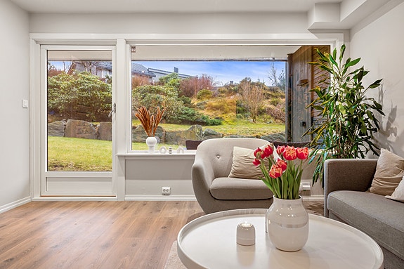 Flott 2-roms med solrik terrasse på 16 m². Fast garasjeplass. Kort vei til buss, bybane og butikk.