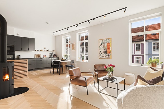 Leiligheten er totalrehabilitert i 2020/2021 og har gjennomgående god planløsning, flotte lys og solforhold. Sjeldent stor privat takterrasse med utsikt mot Fløien samt tilgang til felles hage.