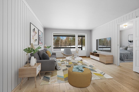 Endeleilighet i 1. etasje og har romslig stue og innglasset veranda hvor du kan gå rett ut på gressplenen.