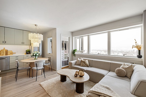 Lys og innbydende leilighet i byggets 9. etasje med heisadkomst. Leiligheten har en praktisk planløsning med åpen stue/kjøkken-løsning, alkove og bad. Oppholdsrommet er luftig og har utgang til innglasset balkong på ca. 6 m². Kjøkken og øvrige overflater er oppgradert i 2023/2024, og badet fremstår moderne etter oppussing i 2024. Det disponeres skap i kjeller, fellesvaskeri i bygget og det medfølger oppmerket parkeringsplass.