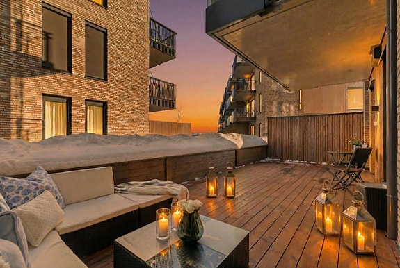 Meget pen og påkostet 3-roms hjørneleilighet fra 2023. Stor terrasse på 27m². Vannbåren gulvvarme. Garasje med el.