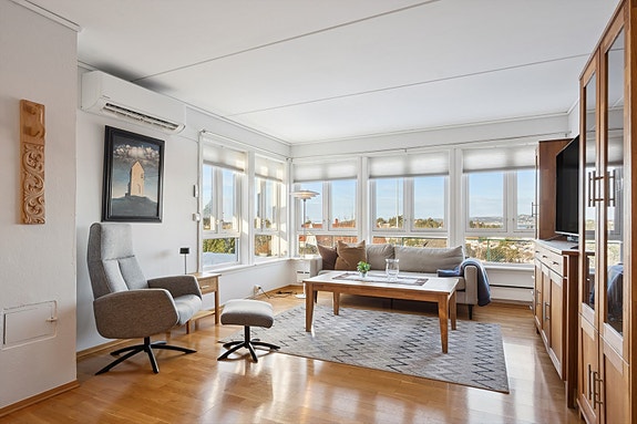 Velholdt 3-roms eierleilighet med sjøutsikt | Sydvest markterrasse på 13 kvm | Garasjeplass