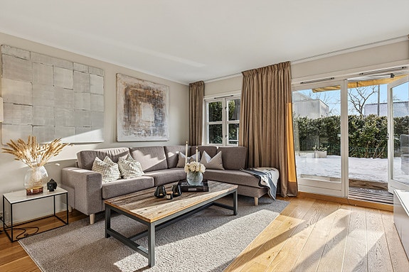 Lys og delikat 3-r selveier m/solrik sydvendt markterrasse på 30 m². Peis. Egen inngang. Trappefri adkomst. Garasjeplass