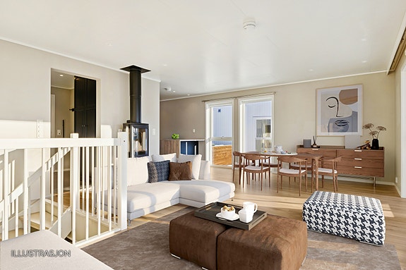 - Hovedetasjen består av en romslig stue, kjøkken, kontor og flislagt yttergang. Her får du fine oppholdsrom, praktiske løsninger og en bolig det er lett å trives i.