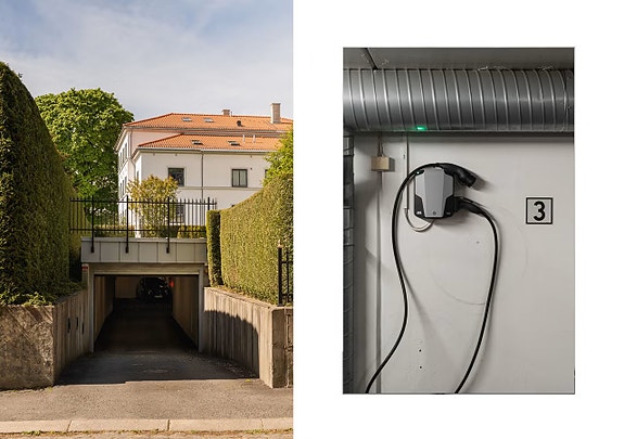 Innendørs parkeringsplass i garasjeanlegg med elbillader montert på vegg. Plassen er egnet for personbil og gir mulighet for lading av elbil eller ladbar hybrid via fastmontert ladeenhet. Tilgang skjer via innkjøring til felles garasjeanlegg under bygning.