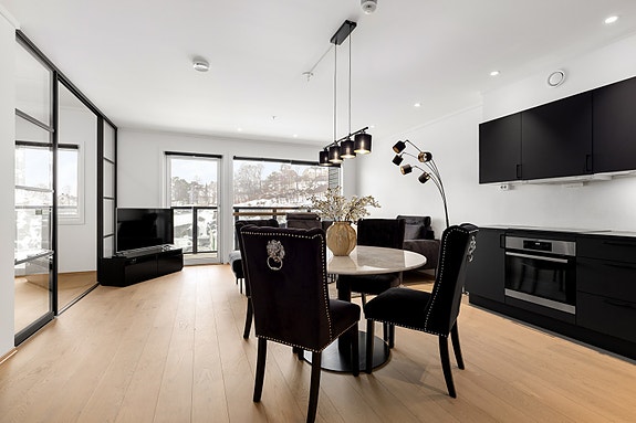 Praktisk planløsning med to soverom, åpen stue/kjøkkenløsning med plass til både spisebord og sofagruppe, flislagt bad/ vaskerom, bod og romslig entré. Ut fra stuen har du en solrik balkong på ca. 13kvm. Parkeringsplass i felles garasjeanlegg med EL-billader. Sportsbod i underetasjen.