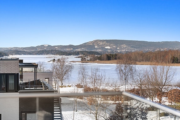 Herlig utsikt fra omkransende takterrasse på 52 kvm. Sol fra morgen til sen kveldstid på sommeren