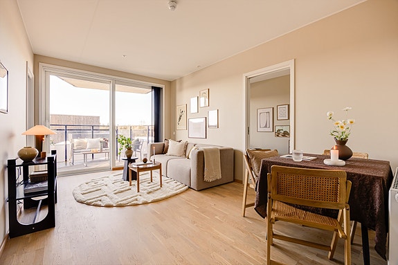 Dette er en lys og moderne 3-roms leilighet fra 2021 med vestvendt balkong og garasjeplass. Leiligheten holder en høy standard med stilrene overflater, moderne farger og store vindusflater. Her får du en gjennomtenkt planløsning som inneholder entré, bad, åpen stue/kjøkkenløsning og to soverom. Fra stuen er det utgang til en herlig balkong hvor ettermiddagene kan nytes, eller så kan man benytte seg av sameiets felles takterrasse. Her bor du i et nyere og attraktivt område på Lørenskog med gangavstand til alt du trenger i hverdagen.