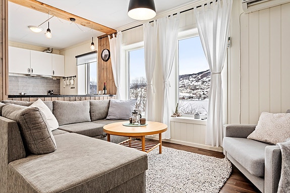 Velkomen til ei triveleg og lettstelt leiligheit med flott utsikt over Hafslovatnet. Bustaden har ei open og praktisk løysing der stove og kjøkken ligg i same rom, noko som gir ei luftig og funksjonell kjensle. Store vindauge slepp inn godt med lys og gir ei fin kontakt med naturen utanfor.