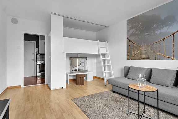 Leiligheten har en praktisk planløsning med entré, lys stue, eldre, funksjonelt kjøkken og helfliset bad. Sengen er smart integrert i stuen for å utnytte plassen optimalt. Busstopp med hyppige avganger like i nærheten.