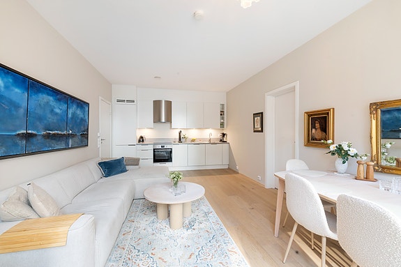Gang, stue med plass til spisestue, kjøkken med integrerte hvitevarer, helfliset bad, 2 soverom og innvendig bod/garderoberom. Vannboren varme i alle gulv utenom soverom og bod.