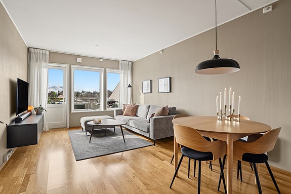En ypperlig leilighet for par, pendlere og som førstegangskjøp! Sørvestvendt beliggenhet i 3. etasje med utsikt mot sjø og fjell. Gjennomgående planløsning med entré med skyvedørsgarderobe, flislagt bad, soverom samt en åpen stue- og kjøkkenløsning. Bygget har heis, sykkelbod og en stor felles takterrasse. Veldrevet borettslag med sikringsordning og IN-ordning. Ved full innfrielse av fellesgjeld, reduseres felleskostnadene til kr 3 127/mnd.