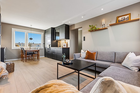 Leiligheten har en særdeles attraktiv beliggenhet i et populært og veletablert boområde, kjent for sine gode solforhold og rolige omgivelser. Den ligger sørvendt og usjenert til, noe som gir rikelig med naturlig lys gjennom dagen samt en fin og åpen utsikt over nærområdet og de velholdte fellesarealene. Her bor man skjermet fra innsyn, samtidig som man har en luftig og behagelig atmosfære rundt seg.