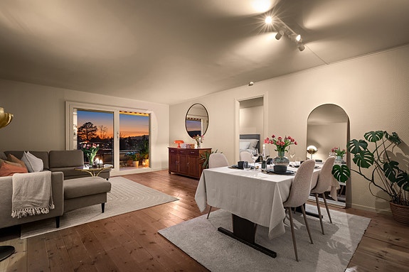 Gjennomgående 4-roms med utsikt og solrike uteplasser. To bad fra 2018 - Garasjeparkering - God intern beliggenhet.