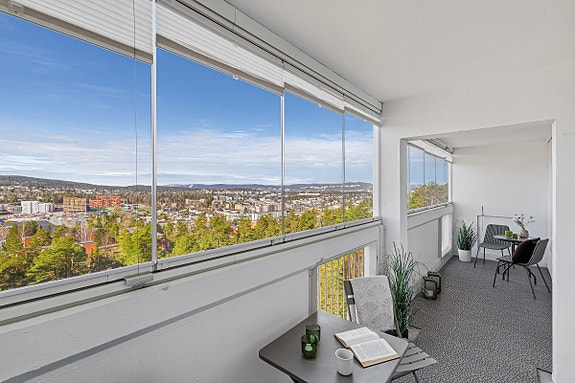 Praktisk og gjennomgående 3-roms endeleilighet med solrik innglasset balkong og nydelig utsikt | Garasjeplass!