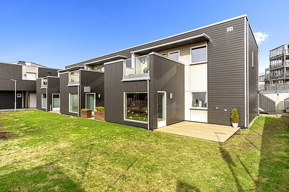 - Romslig sørvestvendt terrasse med meget gode solforhold. Direkte tilkomst til felles grøntareal