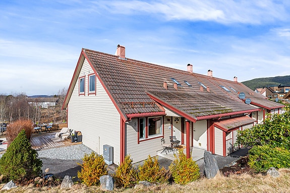 Enderekkehus med barnevennlig beliggenhet, stor solrik terrasse, flott utsikt. Garasjeplass med el-bil lader.