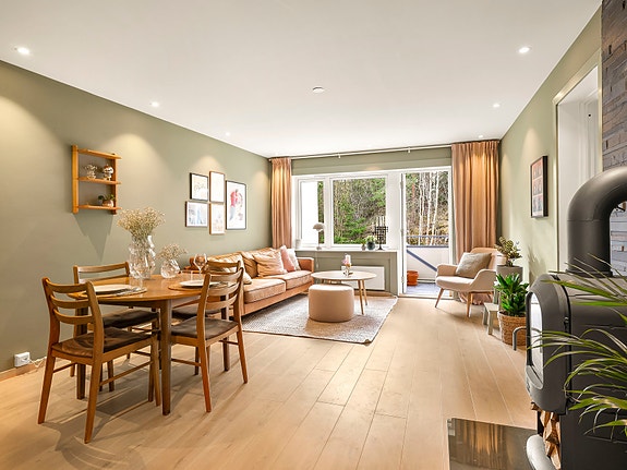 Leiligheten har et delikat kjøkken fra 2023 med integrerte hvitevarer, gjennomtenkte løsninger og rikelig med oppbevaringsplass. Stuen er lys og romslig med gode vindusflater som slipper inn rikelig med naturlig lys. Her er det gode møbleringsmuligheter og en hyggelig peis for komfort. Leiligheten er malt i behagelige fargetoner og nyere (2021) laminatgulv for et moderne inntrykk.