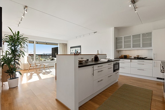 Kjøkkenet ligger i åpen løsning mot stuen og har innredning med glatte fronter.