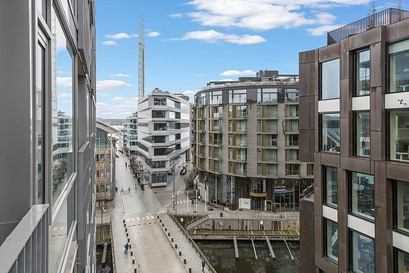Velkommen til Olav Selvaags Plass 4! En arealeffektiv 2-roms selveierleilighet i 7. etasje med vestvendt overbygget balkong og utsikt mot kanalen.