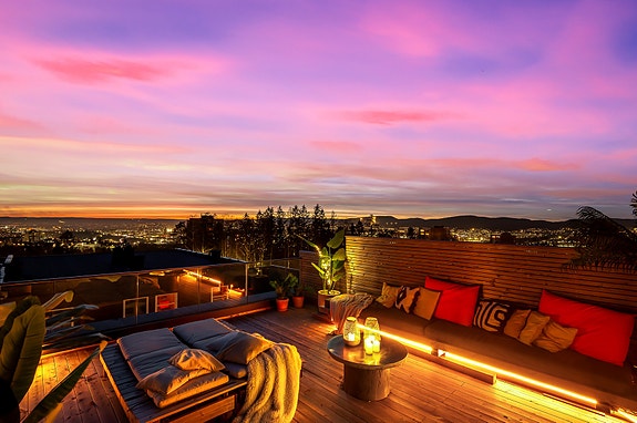 Rekkehuset har en familievennlig beliggenhet og egen takterrasse med fantastisk utsikt over byen og fjorden.