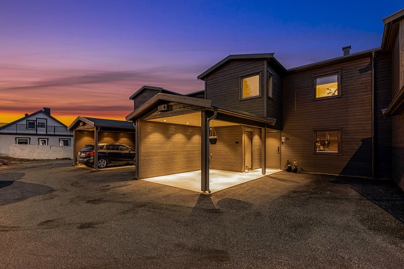 Gode parkeringsmuligheter i carport og på gårdsplass foran boligen