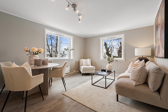 Leiligheten får rikelig med naturlig dagslys fra vinduer på flere vegger. Selger skal montere fransk balkong på vindu til høyre. Dette blir etter planen montert mot slutten av mai for selgers regning.