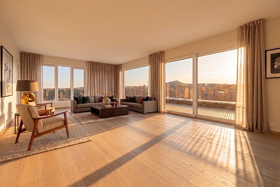 Fastpris: Ny/stor 4-roms toppleil. Ca. 22 kvm sydvestvendt takterrasse i 5. etg. 2 bad. Garasjeplass. Flytt inn 25. juni