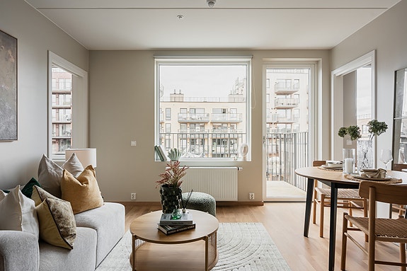 Leiligheten ligger i 6. etasje med heisadkomst og har en praktisk planløsning med åpen stue- og kjøkkenløsning. Her er det gjennomgående én-stavs eikeparkett og vannbåren varme som gir en jevn temperatur. Fra stuen er det utgang til en overbygd balkong på 7 m². Beliggenheten er sentral med gangavstand til Triaden Lørenskog Storsenter, bussforbindelser og marka med turstier. Borettslaget har også tilgang til felles sykkelparkering og sykkelverksted.