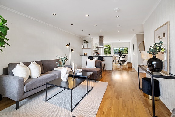 Gjennomgående rekkehusleilighet med 2 nye uteplasser | Åpen stue/kjøkken | Egen garasje i anlegg fra 2018