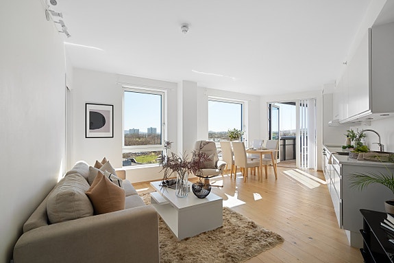 Lervigbrygga 128 er en flott endeleilighet med nydelig sjøutsikt, vinduer fra tak til gulv og moderne og fint design.