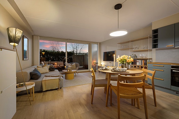 Delikat 3-roms med rekkehusfølelse. To solrike markterrasser på til sammen 35 kvm. Heis og garasjeplass m/EL