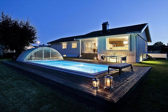 Utover svømmebasseng og flotte uteoppholdsarealer i hagen har eiendommen garasje med bod og carport i tilknytning til overbygget inngangsparti.